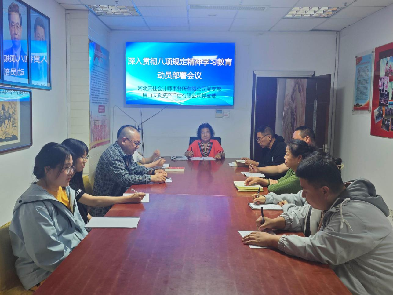 为深入贯彻落实中央八项规定精神,按照财政部对开展深入贯彻中央八项规定精神学习教育进行动员部署会议的要求,2025年4月25日河北天阔集团党总支、河北天佳会计师事务所有限公司党支部、唐山天勤资产评估有限公司党支部联合召开深入贯彻中央八项规定精神学习教育活动动员部署会议,认真学习贯彻习近平总书记关于深入贯彻中央八项规定精神学习教育的重要讲话和重要指示精神,传达学习中央党的建设工作领导小组会议、中共中央办公厅《关于在全党开展深入贯彻中央八项规定精神学习教育的通知》精神,紧密结合实际对公司开展深入贯彻中央八项规定精神学习教育进行部署,正式启动公司系统学习教育。中共唐山市注册会计师(资产评估)行业党委委员、河北天阔集团党总支书记、董事长、总经理赵义平同志作动员部署讲话,河北天阔集团领导班子成员,会计所、评估公司负责人及部分党员参会。